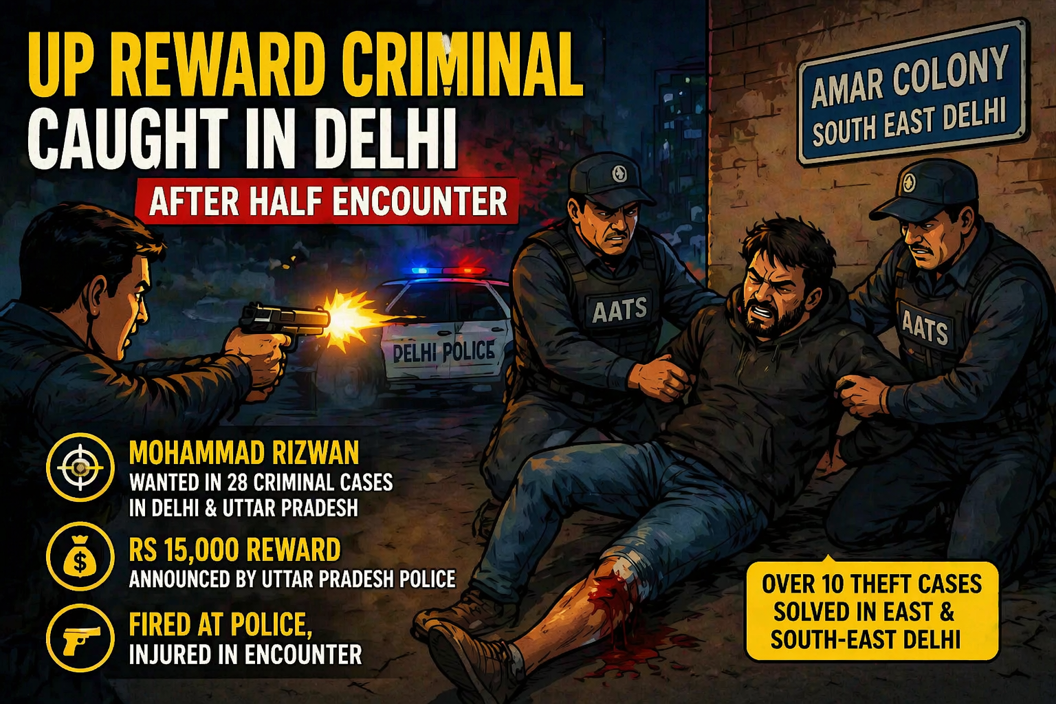 Read Nowदिल्ली में यूपी के इनामी बदमाश का ‘हाफ एनकाउंटर’, पैर में गोली लगने के बाद गिरफ्तार