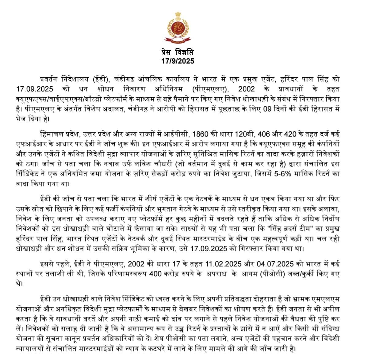 ED / Chandigarh Zonal Office — प्रेस रिलीज़ / PAO (Aug 2025)। Directorate of Enforcement