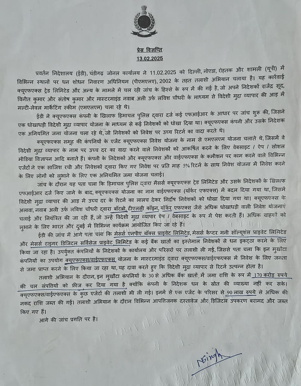 ईडी (Enforcement Directorate) ने QFX/YFX/BotBro जैसे प्लेटफॉर्म से जुड़ी संदिग्ध धन-राशियों की जांच में 30 से अधिक बैंक खातों में जमा करीब ₹170 करोड़ फ्रीज किए; फरवरी 2025 में बड़े पैमाने पर तलाशी अभियान चला। DD News+1