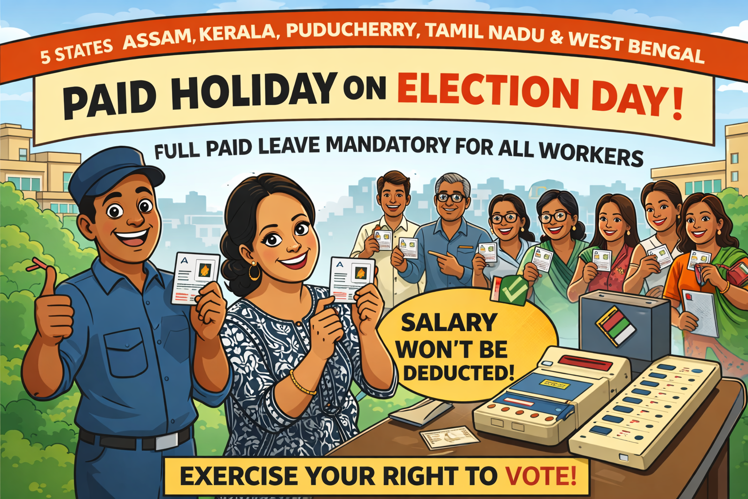 नई दिल्ली। भारतीय चुनाव आयोग ने मतदान के अधिकार को सुनिश्चित करने के लिए बड़ा फैसला लिया है। आयोग ने चार राज्यों और एक केंद्र शासित प्रदेश में मतदान वाले दिन सार्वजनिक अवकाश घोषित करने के निर्देश जारी किए हैं। स्पष्ट किया गया है कि इस दिन किसी भी कर्मचारी के वेतन में कटौती नहीं की जा सकती।