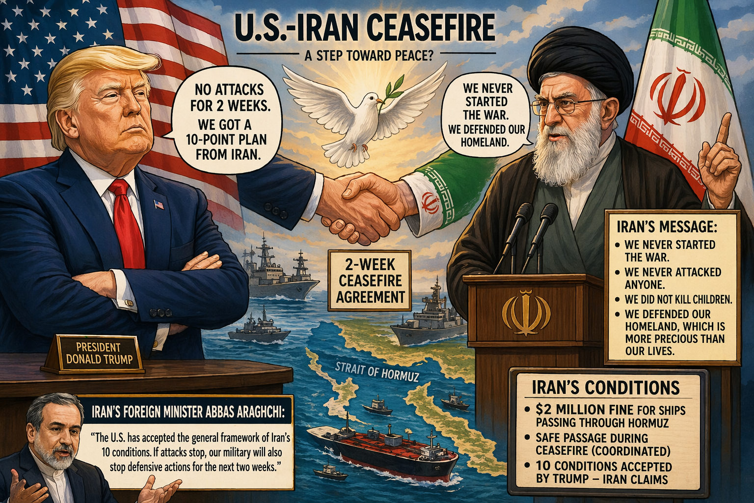 ईरान के विदेश मंत्री अब्बास अराघची ने कहा कि अमेरिका ने ईरान की 10 शर्तों के सामान्य ढांचे को बातचीत का आधार मान लिया है। उन्होंने सोशल मीडिया पर लिखा कि यदि ईरान पर हमले बंद रहते हैं, तो ईरानी सेना भी अपनी रक्षात्मक कार्रवाई रोक देगी।