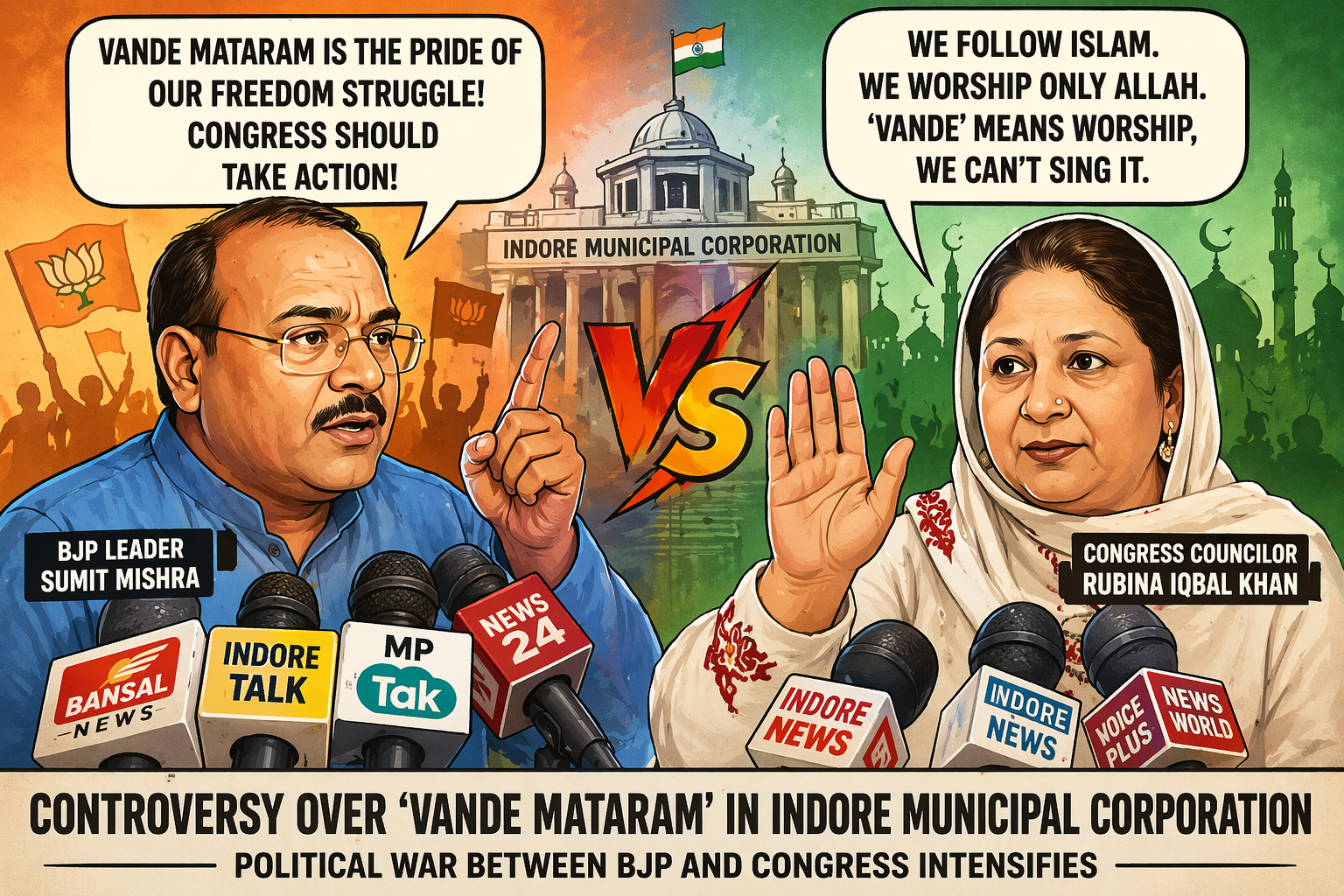 इंदौर। नगर निगम के बजट सम्मेलन के दौरान ‘वंदे मातरम’ गाने को लेकर शुरू हुआ विवाद अब राजनीतिक बयानबाजी का रूप ले चुका है। कांग्रेस की पार्षद रुबीना इकबाल खान द्वारा ‘वंदे मातरम’ गाने से इनकार किए जाने के बाद भाजपा और कांग्रेस के बीच आरोप-प्रत्यारोप तेज हो गए हैं।