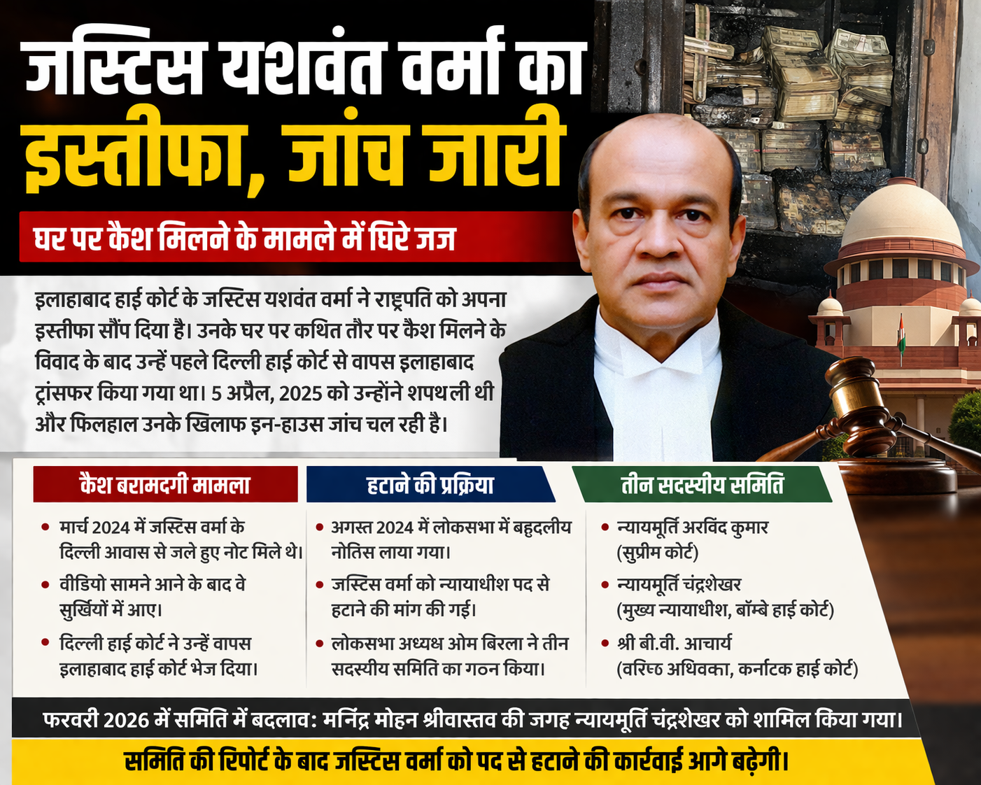 इलाहाबाद हाई कोर्ट के जस्टिस यशवंत वर्मा ने राष्ट्रपति को अपना इस्तीफा दे दिया है। उनके घर पर कथित तौर पर कैश मिलने के विवाद के बाद उन्हें पहले दिल्ली हाई कोर्ट से वापस इलाहाबाद ट्रांसफर कर दिया गया था। उन्होंने 5 अप्रैल, 2025 को शपथ ली थी और अभी उन पर इन-हाउस जांच चल रही है। आरोपों के सिलसिले में उन्हें पार्लियामेंट्री रिमूवल प्रोसीडिंग्स की भी संभावना है। लोकसभा अध्यक्ष ओम बिरला ने जस्टिस यशवंत वर्मा को उनके पद से हटाने के लिए तीन सदस्यीय जांच समिति बनाई है। इस समिति की रिपोर्ट आने के बाद जस्टिस वर्मा को पद से हटाने की कार्रवाई आगे बढ़ेगी।