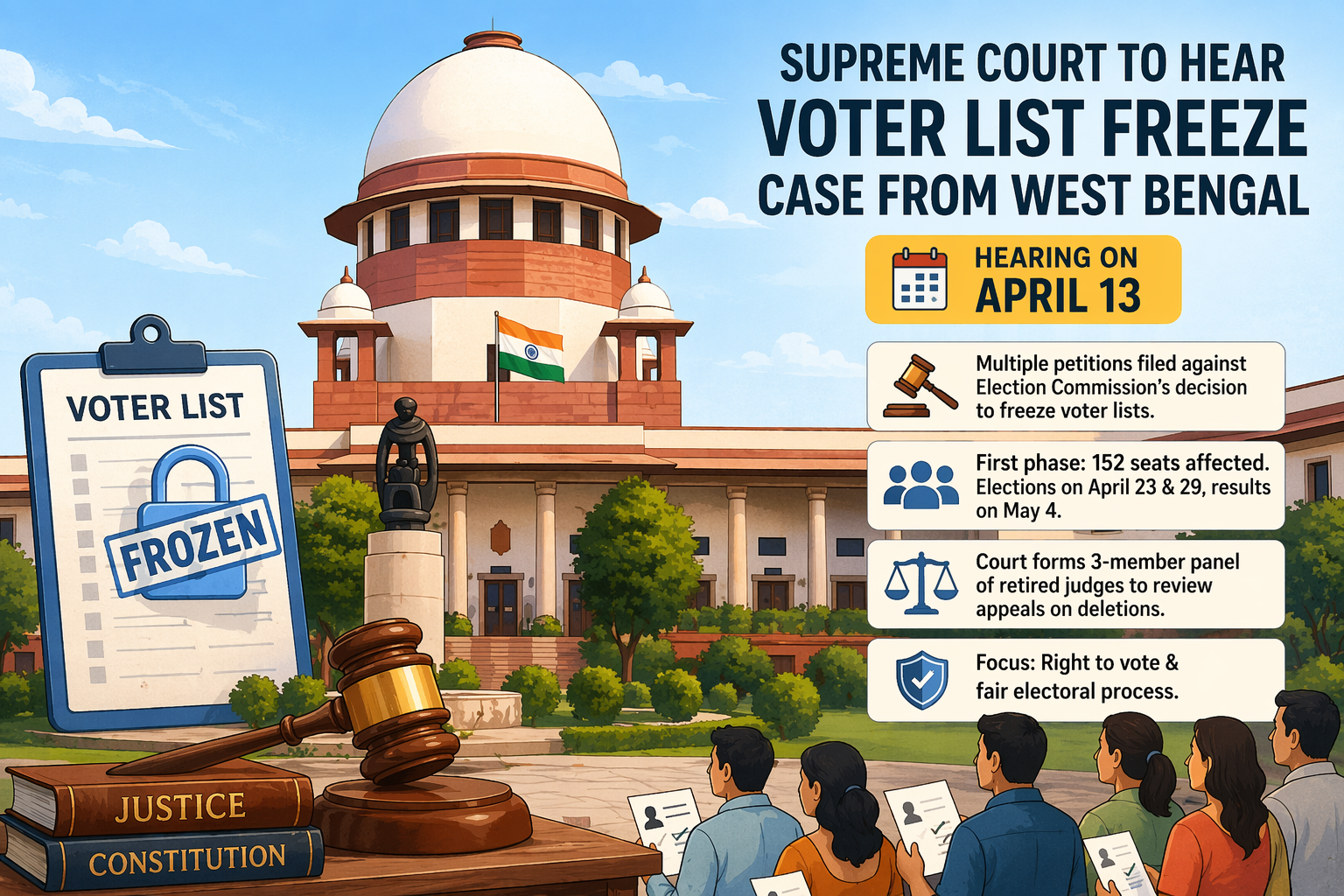 पश्चिम बंगाल में विधानसभा चुनाव से पहले वोटर लिस्ट को फ्रीज करने के फैसले पर विवाद गहरा गया है। इस मामले में सुप्रीम कोर्ट अब 13 अप्रैल को सुनवाई करेगा। चुनाव आयोग द्वारा पहले चरण की 152 सीटों के लिए मतदाता सूची फ्रीज किए जाने के खिलाफ कई याचिकाएं दायर की गई हैं, जिन्हें एक साथ सुना जाएगा।