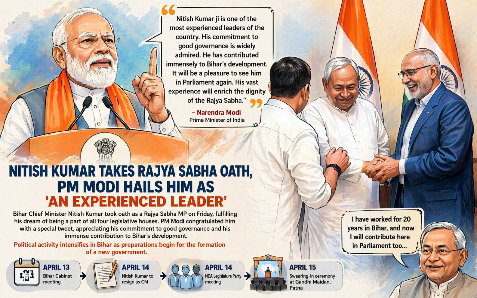 - 15 अप्रैल: पटना के गांधी मैदान में शपथ ग्रहण समारोह संभव