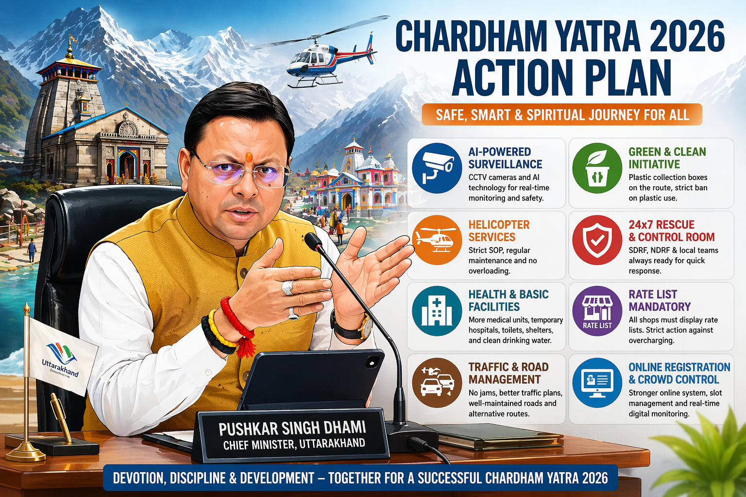 देहरादून। चारधाम यात्रा-2026 को अधिक सुव्यवस्थित, सुरक्षित और तकनीकी रूप से उन्नत बनाने के लिए उत्तराखंड सरकार ने व्यापक एक्शन प्लान तैयार किया है। मुख्यमंत्री पुष्कर सिंह धामी ने अधिकारियों को स्पष्ट निर्देश दिए हैं कि यात्रा के दौरान श्रद्धालुओं की सुरक्षा और सुविधा सर्वोच्च प्राथमिकता रहे।