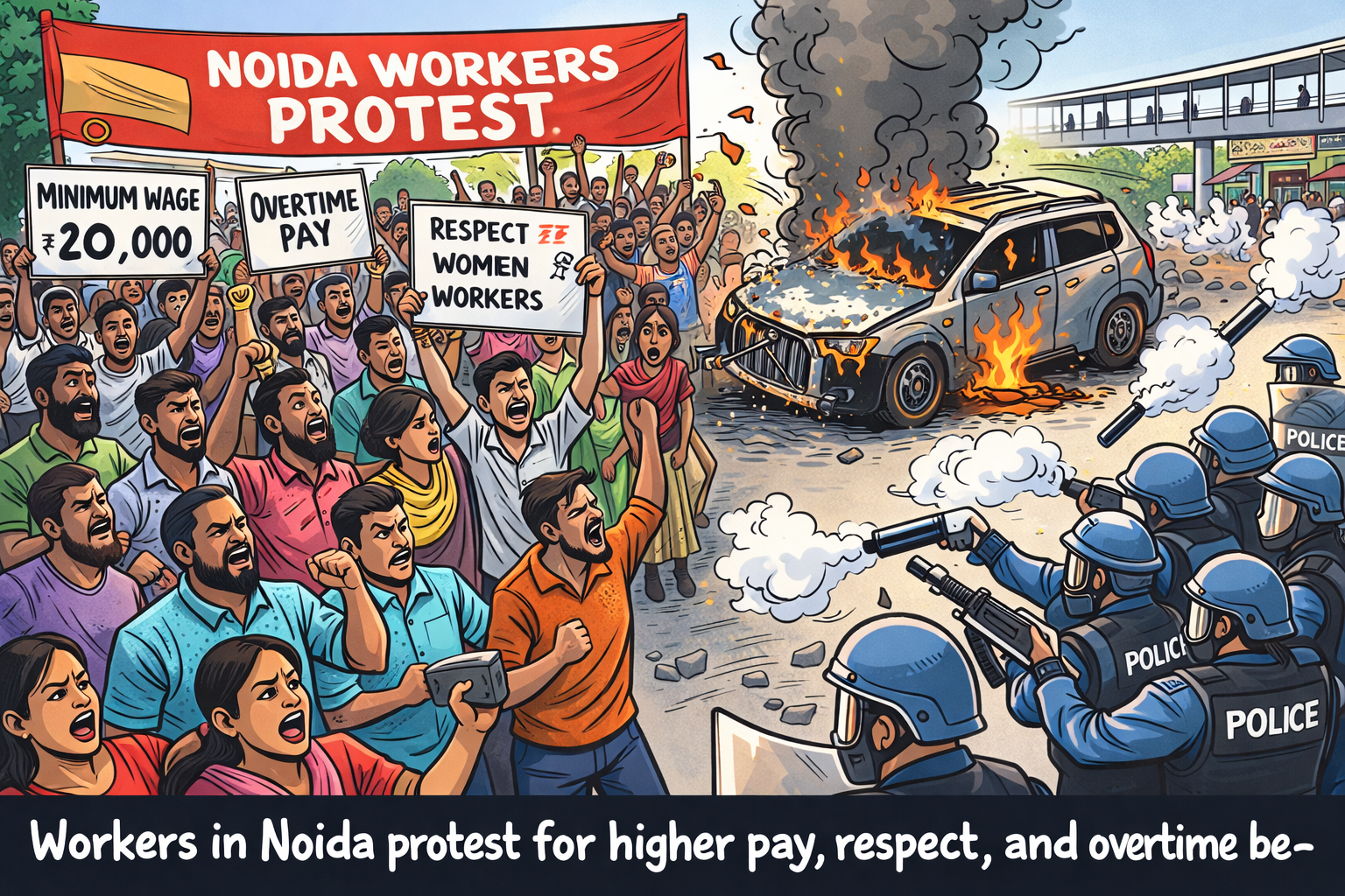 उत्तर प्रदेश के औद्योगिक शहर नोएडा में मजदूरों का प्रदर्शन सोमवार को अचानक उग्र हो गया। पिछले तीन दिनों से चल रहा शांतिपूर्ण विरोध आज हिंसक रूप ले बैठा। प्रदर्शनकारियों ने नोएडा फेज-2 और सेक्टर-62 समेत कई इलाकों में सड़क जाम कर दिया, पथराव किया और कुछ वाहनों में आगजनी की। स्थिति को नियंत्रित करने के लिए पुलिस को आंसू गैस के गोले छोड़ने पड़े और भारी संख्या में फोर्स तैनात की गई।
