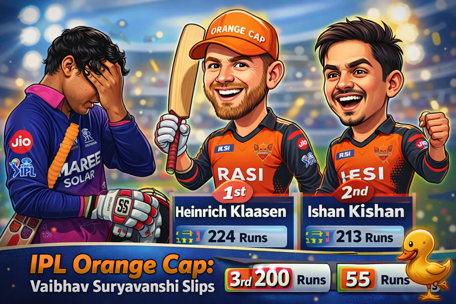 आईपीएल में ऑरेंज कैप की रेस अब बेहद रोमांचक मोड़ पर पहुंच गई है। एक समय तक इस पर कब्जा जमाए बैठे वैभव सूर्यवंशी अब तीसरे स्थान पर खिसक गए हैं। उनकी जगह अब सनराइजर्स हैदराबाद के बल्लेबाजों ने बाजी मार ली है।