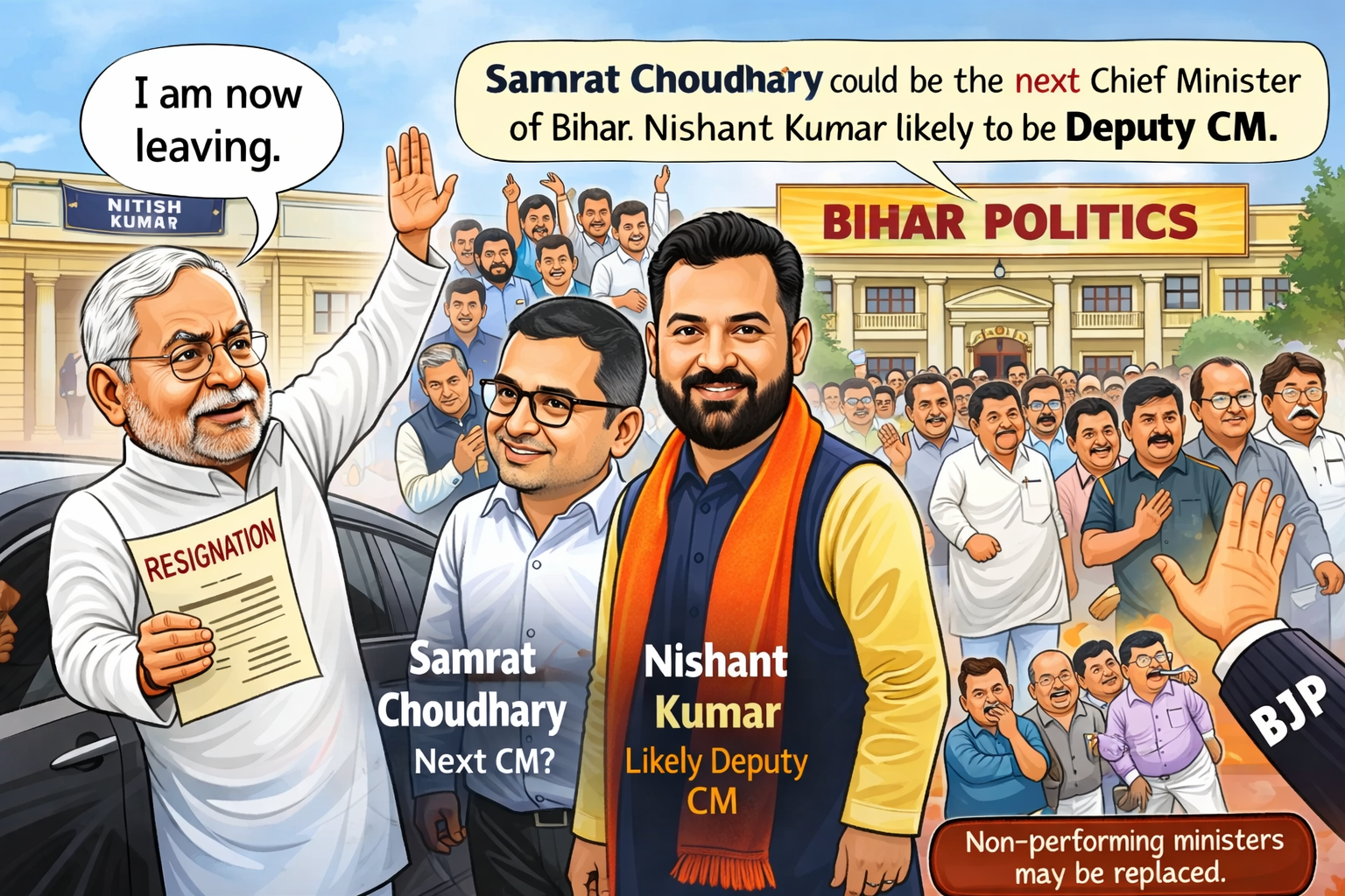 पटना: बिहार की राजनीति में आज बड़ा घटनाक्रम सामने आया है। मुख्यमंत्री नीतीश कुमार ने अपनी आखिरी कैबिनेट बैठक में इस्तीफे का ऐलान कर दिया है, जिसके बाद राज्य में नेतृत्व परिवर्तन लगभग तय माना जा रहा है। अब सभी की नजरें इस बात पर टिकी हैं कि बिहार का अगला मुख्यमंत्री कौन होगा।