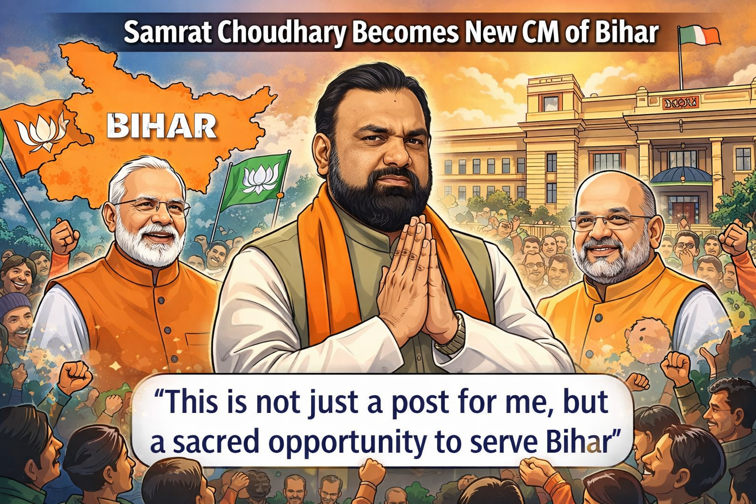 рдмрд┐рд╣рд╛рд░ рдХреА рд╕рд┐рдпрд╛рд╕рдд рдореЗрдВ рдмрдбрд╝рд╛ рдмрджрд▓рд╛рд╡ рджреЗрдЦрдиреЗ рдХреЛ рдорд┐рд▓рд╛ рд╣реИред рд╕рдореНрд░рд╛рдЯ рдЪреМрдзрд░реА рдХреЛ рд░рд╛рдЬреНрдп рдХрд╛ рдирдпрд╛ рдореБрдЦреНрдпрдордВрддреНрд░реА рдмрдирд╛рдП рдЬрд╛рдиреЗ рдХреЗ рдмрд╛рдж рдЙрдиреНрд╣реЛрдВрдиреЗ рдЕрдкрдирд╛ рдкрд╣рд▓рд╛ рдмрдпрд╛рди рдЬрд╛рд░реА рдХрд┐рдпрд╛, рдЬрд┐рд╕рдореЗрдВ рдЙрдиреНрд╣реЛрдВрдиреЗ рдЗрд╕ рдЬрд┐рдореНрдореЗрджрд╛рд░реА рдХреЛ рдЬрдирддрд╛ рдХреА рд╕реЗрд╡рд╛ рдХрд╛ рдЕрд╡рд╕рд░ рдмрддрд╛рдпрд╛ред
