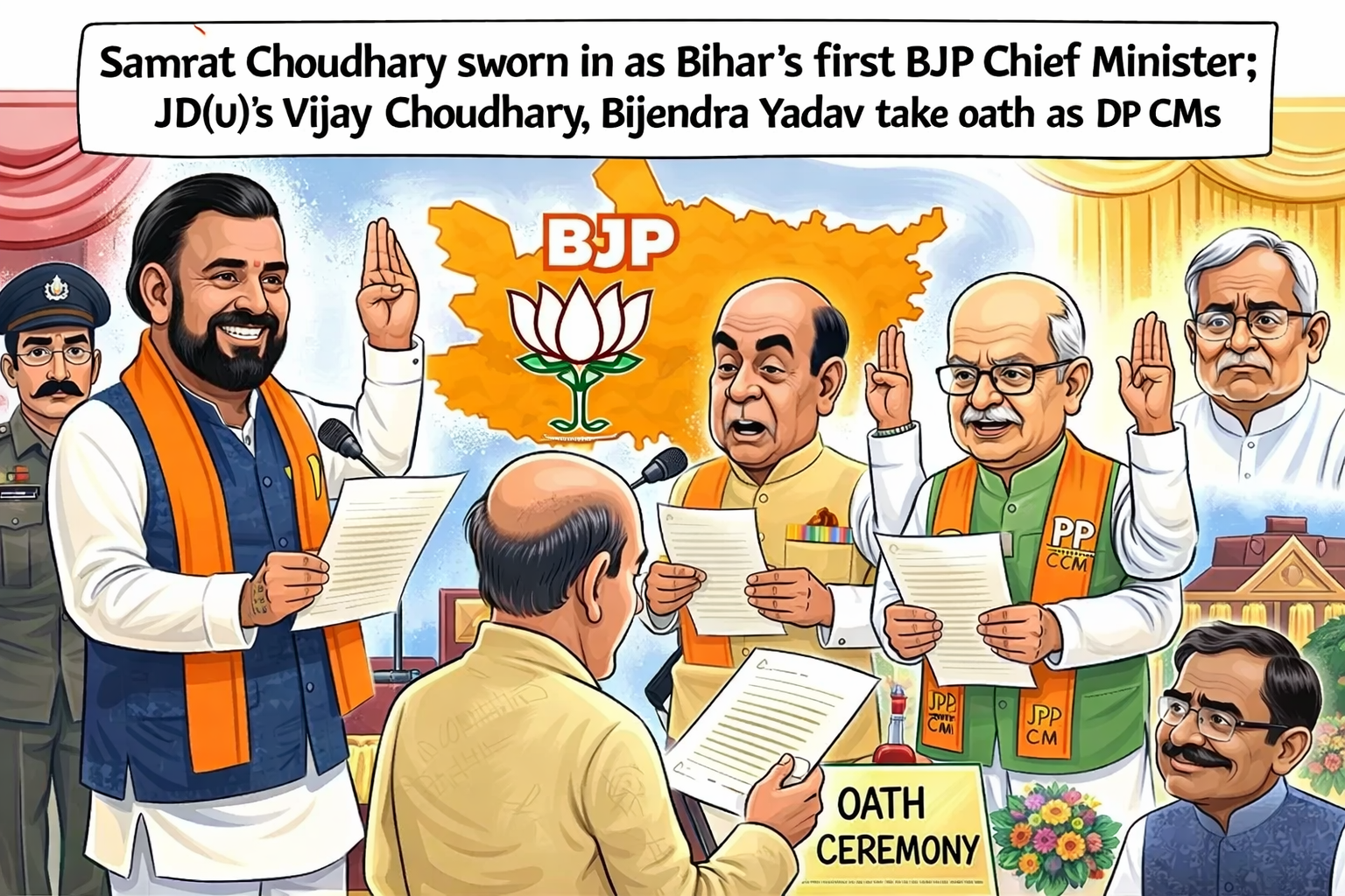 सम्राट चौधरी के साथ जेडीयू के वरिष्ठ नेता विजय चौधरी और बिजेंद्र यादव ने डिप्टी मुख्यमंत्री पद की शपथ ली, जिससे एनडीए गठबंधन की मजबूती का स्पष्ट संदेश सामने आया।