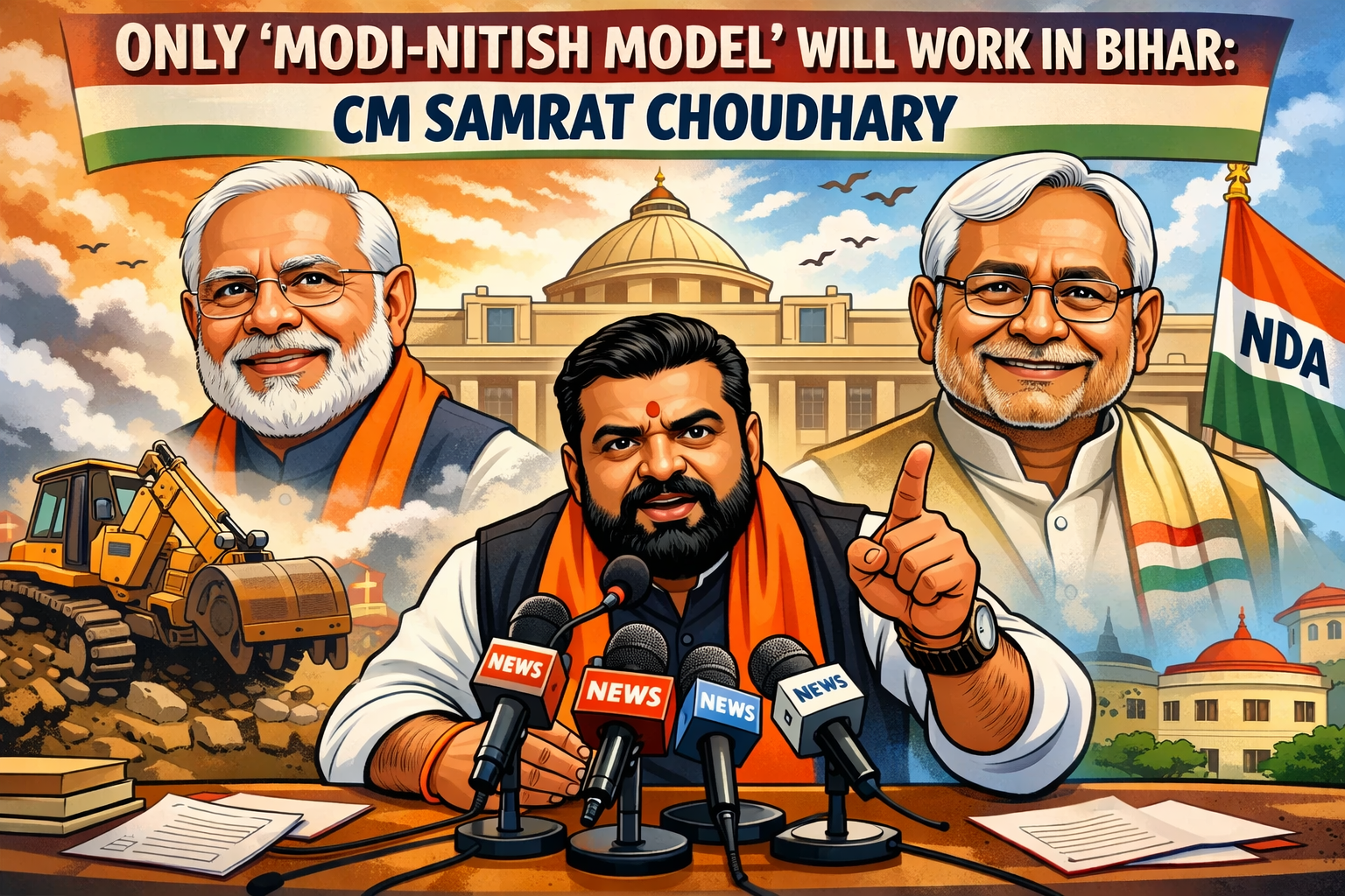 पटना: बिहार की राजनीति में एक बड़ा बदलाव देखने को मिला है, जहां सम्राट चौधरी ने मुख्यमंत्री पद की शपथ लेने के बाद अपने पहले ही बयान में स्पष्ट कर दिया कि राज्य में “सिर्फ मोदी-नीतीश मॉडल” ही लागू होगा। शपथ ग्रहण के तुरंत बाद उन्होंने कहा कि वे बिना किसी देरी के बिहार के विकास कार्यों में जुट जाएंगे।
