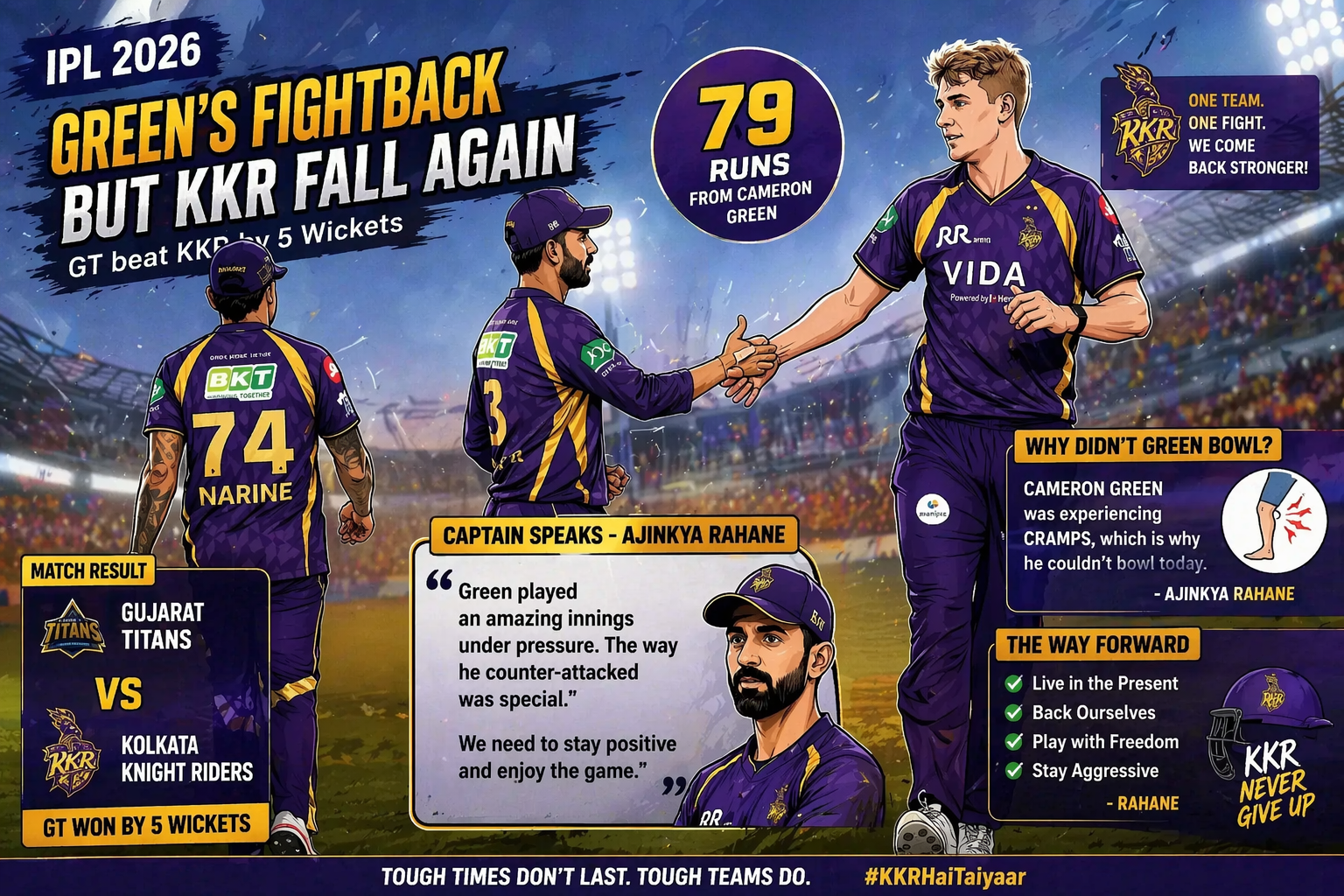 हालांकि इस मुकाबले में केकेआर के लिए एक सकारात्मक पहलू सामने आया—स्टार ऑलराउंडर कैमरून ग्रीन की शानदार वापसी। ग्रीन ने 79 रनों की दमदार पारी खेलकर टीम को संभालने की कोशिश की, लेकिन गेंदबाजी करते नजर नहीं आए।