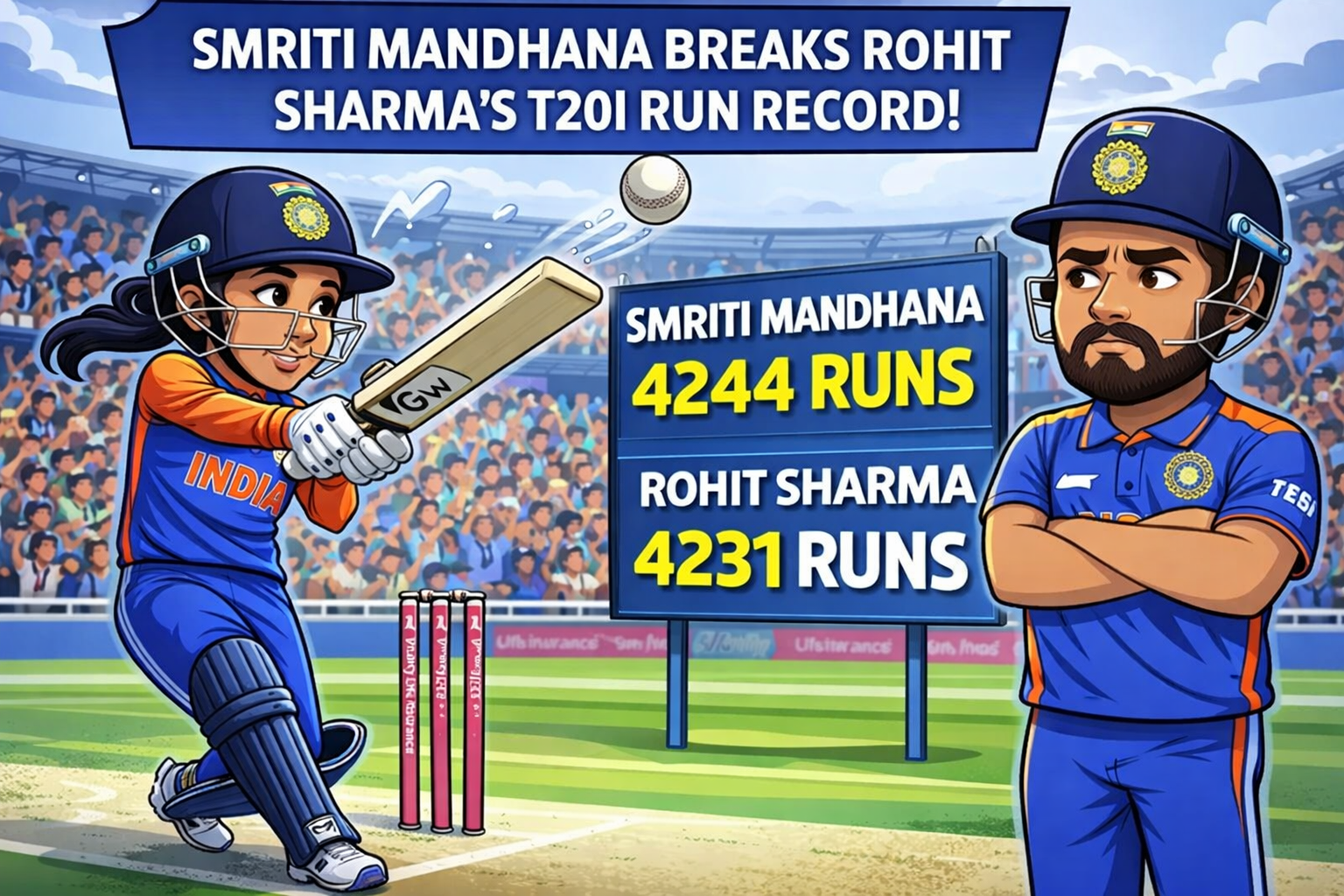 इससे पहले यह रिकॉर्ड Rohit Sharma के नाम था, जिन्होंने अपने टी20 अंतरराष्ट्रीय करियर में 159 मैचों में 4231 रन बनाए थे। मंधाना ने 161 मैचों में 4244 रन बनाकर उन्हें पीछे छोड़ दिया है। उनके नाम एक शतक और 33 अर्धशतक दर्ज हैं, और उनका स्ट्राइक रेट 124.45 का रहा है।