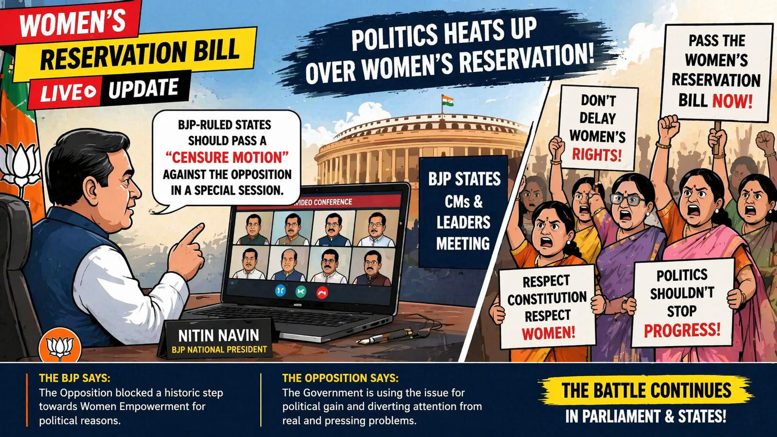 बीजेपी का आरोप है कि विपक्ष ने महिला आरक्षण जैसे महत्वपूर्ण और ऐतिहासिक विधेयक को राजनीतिक कारणों से बाधित किया, जिससे महिला सशक्तिकरण की दिशा में बड़ा कदम रुक गया। वहीं विपक्ष सरकार पर गंभीर मुद्दों से ध्यान भटकाने और राजनीतिक लाभ लेने का आरोप लगा रहा है।