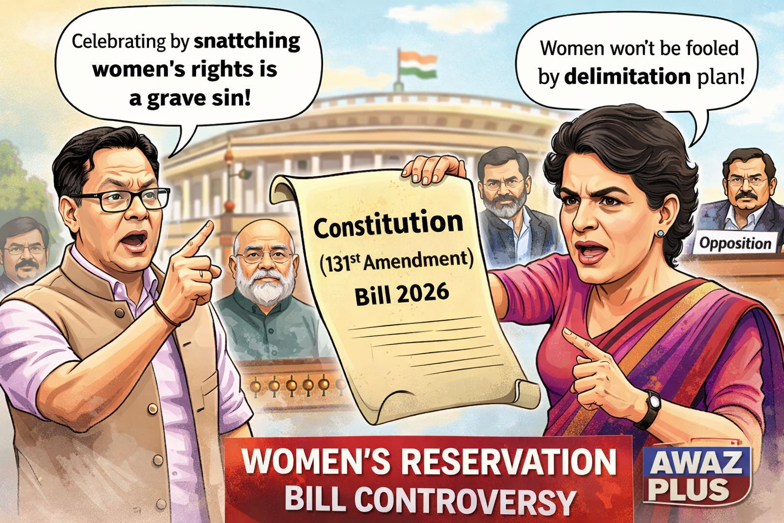 दूसरी ओर, कांग्रेस सांसद प्रियंका गांधी ने सरकार पर निशाना साधते हुए कहा कि महिला आरक्षण की आड़ में परिसीमन को लागू करने की कोशिश की जा रही है, जिसे विपक्ष स्वीकार नहीं करेगा। उन्होंने कहा कि अगर सरकार 2023 के महिला आरक्षण कानून को बिना शर्त लागू करती है, तो विपक्ष उसका समर्थन करने को तैयार है।
