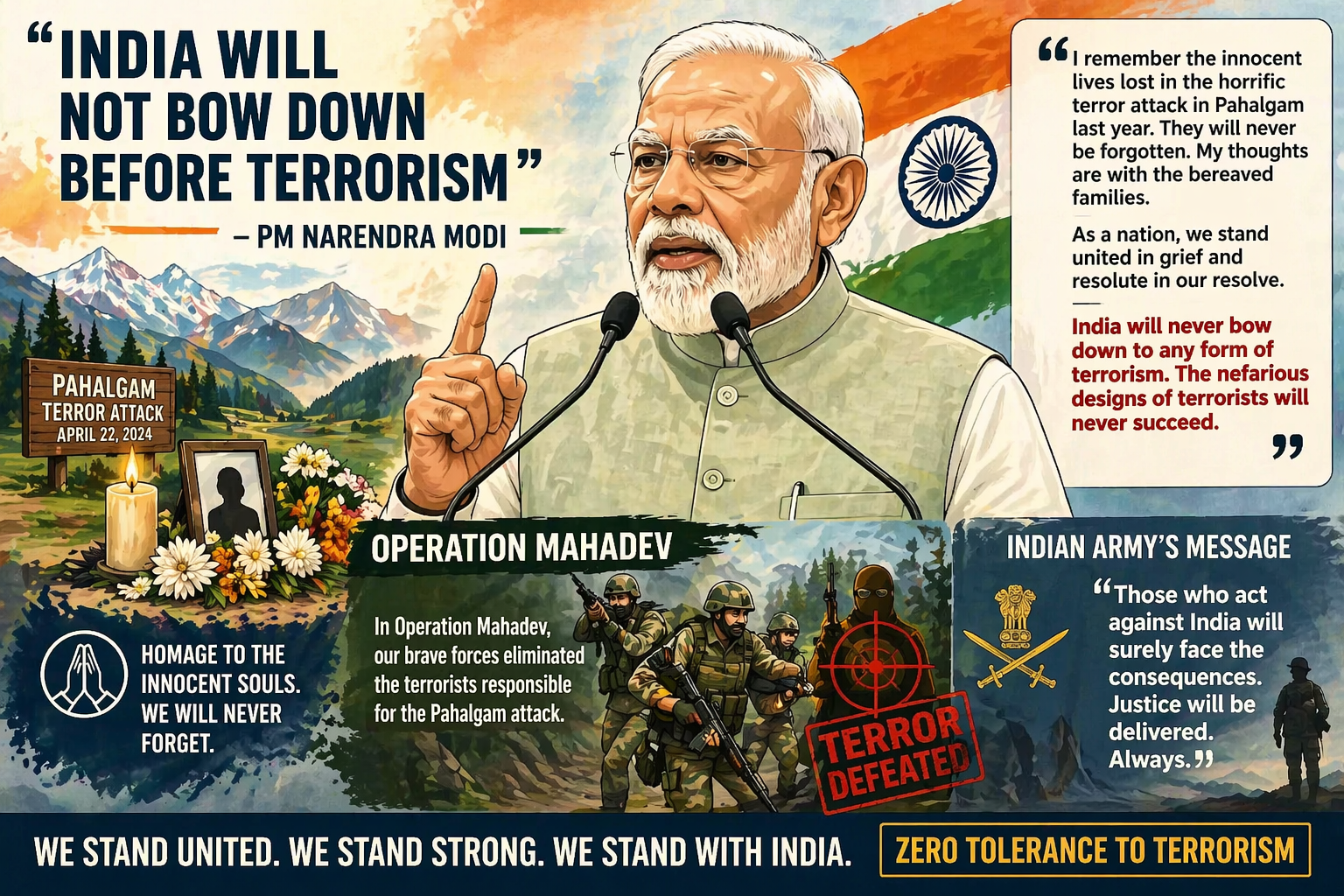 प्रधानमंत्री ने अपने संदेश में लिखा कि “पिछले साल आज ही के दिन पहलगाम में हुए भयानक आतंकी हमले में जान गंवाने वाले निर्दोष लोगों को याद कर रहा हूं। उन्हें कभी भुलाया नहीं जाएगा। मेरी संवेदनाएं उन शोक संतप्त परिवारों के साथ हैं।” उन्होंने स्पष्ट किया कि भारत आतंकवाद के किसी भी रूप के आगे कभी नहीं झुकेगा और आतंकियों के नापाक मंसूबे कभी सफल नहीं होंगे।