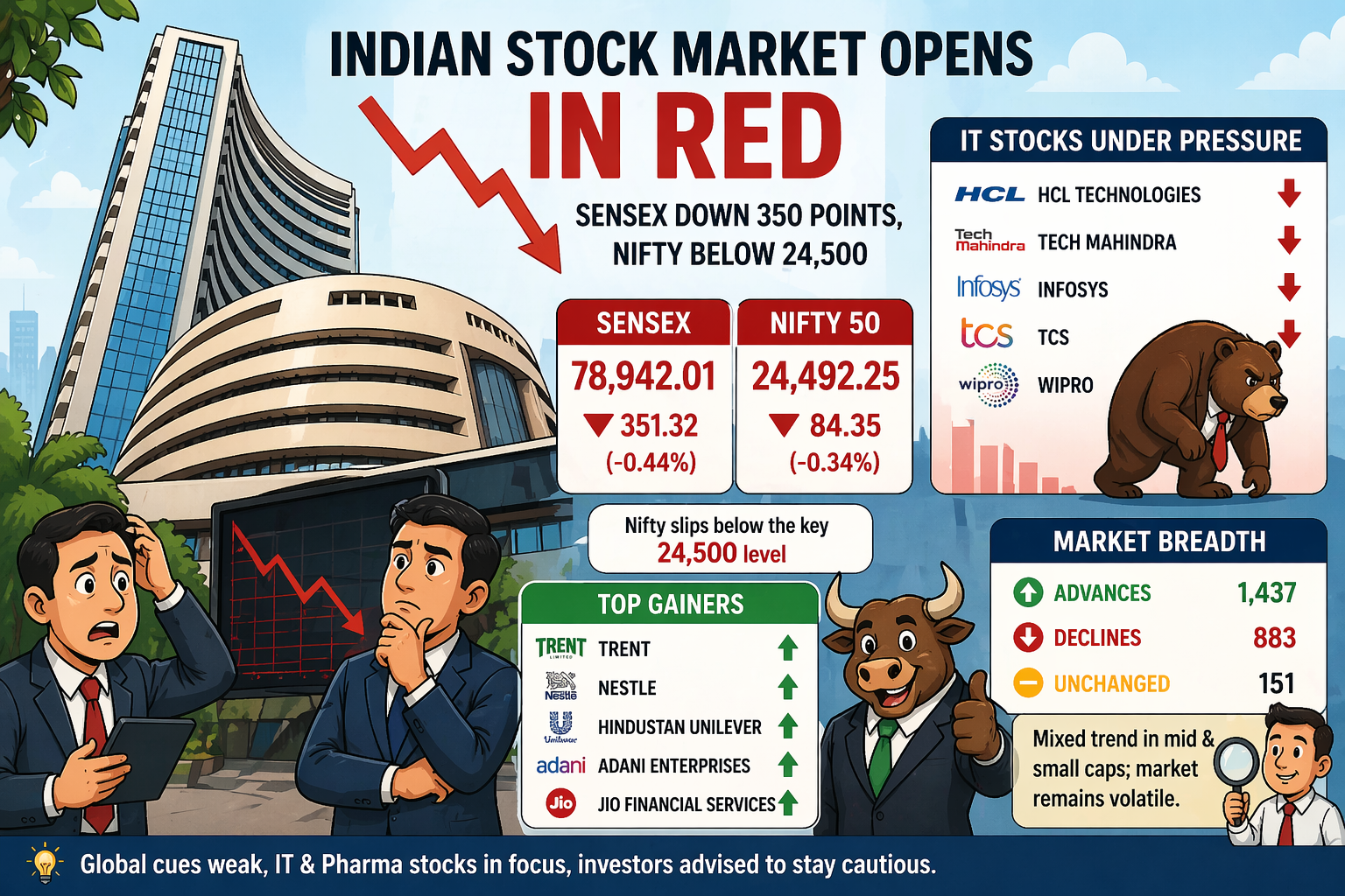 बॉम्बे स्टॉक एक्सचेंज (BSE) का सेंसेक्स 351.32 अंक टूटकर 78,942.01 के स्तर पर पहुंच गया। वहीं, नेशनल स्टॉक एक्सचेंज (NSE) का निफ्टी 84.35 अंकों की गिरावट के साथ 24,492.25 पर कारोबार करता दिखा। निफ्टी का 24,500 के अहम स्तर के नीचे आना बाजार में कमजोरी का संकेत माना जा रहा है।