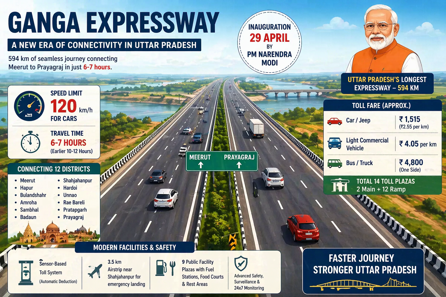 उत्तर प्रदेश में बुनियादी ढांचे का एक और बड़ा अध्याय जुड़ने जा रहा है। मुख्यमंत्री योगी आदित्यनाथ के ड्रीम प्रोजेक्ट ‘गंगा एक्सप्रेसवे’ का उद्घाटन 29 अप्रैल को प्रधानमंत्री नरेंद्र मोदी द्वारा किया जाएगा। 594 किलोमीटर लंबा यह एक्सप्रेसवे पश्चिमी यूपी को सीधे पूर्वी यूपी से जोड़ते हुए यात्रा को तेज, सुरक्षित और सुविधाजनक बनाएगा।