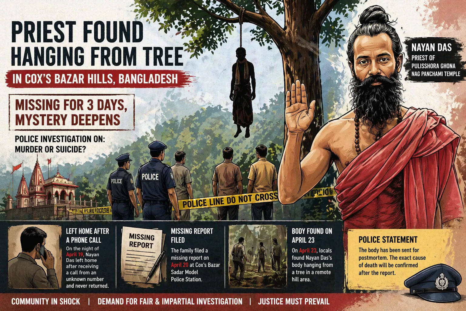 कोक्स बाजार (ढाका): बांग्लादेश के कोक्स बाजार जिले के एक पहाड़ी क्षेत्र में मंदिर के पुजारी नयन दास का शव पेड़ से लटकता हुआ मिलने से सनसनी फैल गई है। वह पिछले तीन दिनों से लापता थे।