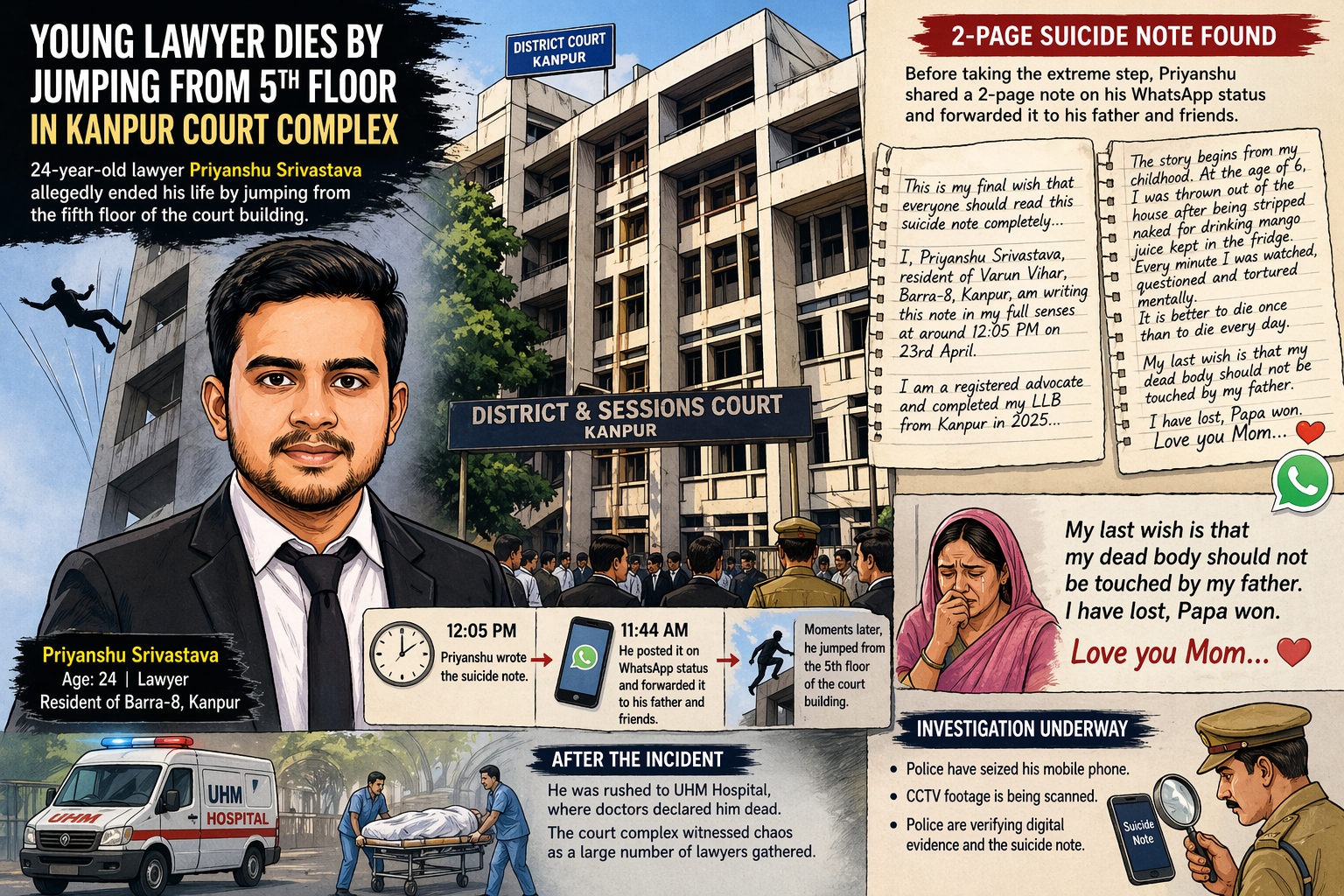 कानपुर कोर्ट परिसर में सनसनी: 5वीं मंजिल से कूदकर युवा वकील ने दी जान, सुसाइड नोट में छलका दर्द