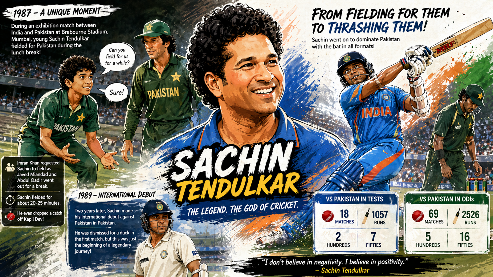 क्रिकेट के इतिहास में कई दिलचस्प किस्से दर्ज हैं, लेकिन महान बल्लेबाज़ Sachin Tendulkar से जुड़ा एक ऐसा वाकया है, जो आज भी फैंस को हैरान कर देता है। अपने करियर में पाकिस्तान के खिलाफ कई रिकॉर्ड बनाने वाले सचिन ने एक बार उसी पाकिस्तान टीम के लिए मैदान पर फील्डिंग भी की थी।