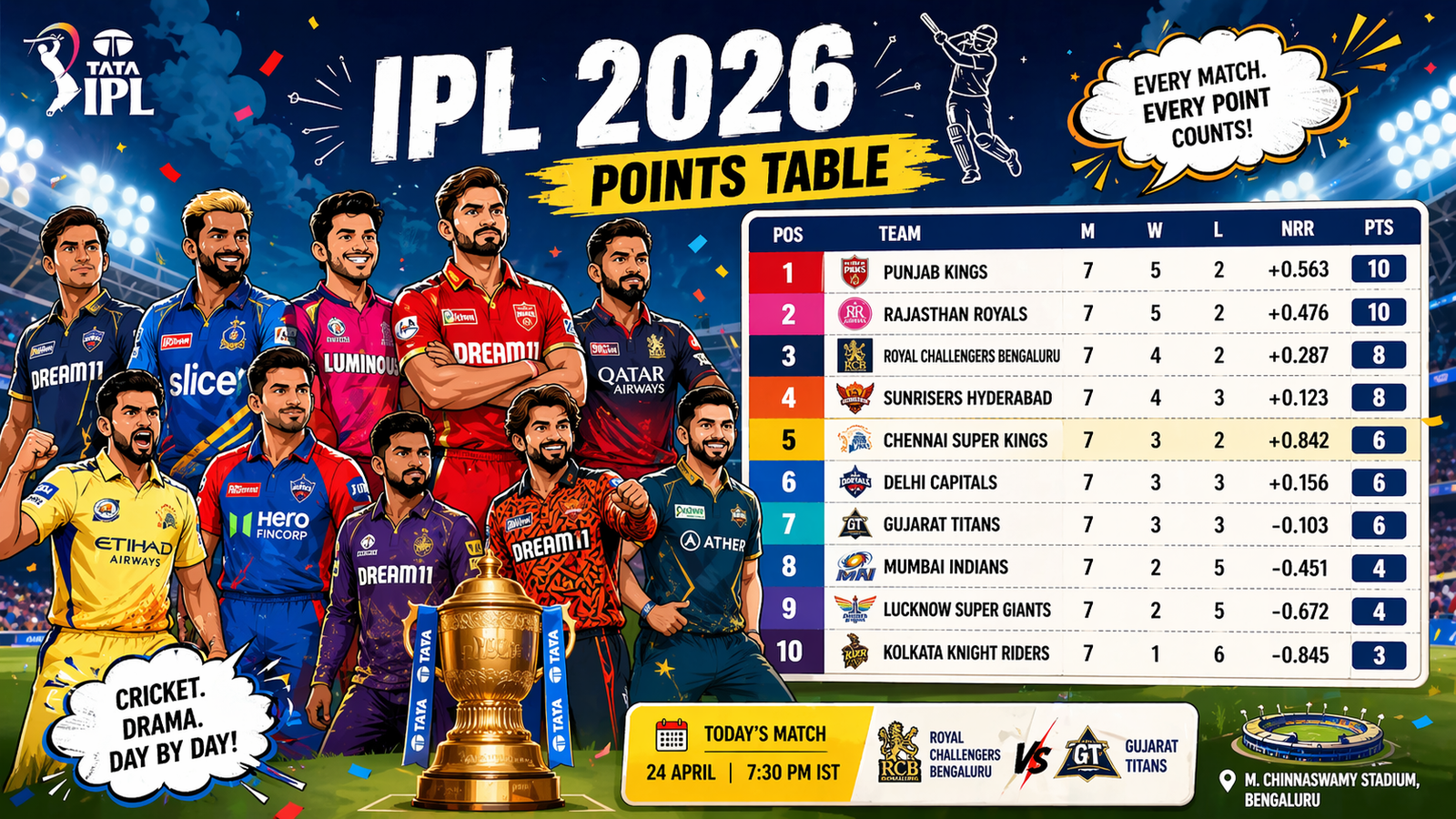 गेंदबाजी में Josh Hazlewood और Bhuvneshwar Kumar की जोड़ी विपक्षी बल्लेबाजों के लिए चुनौती बन सकती है। चिन्नास्वामी में घरेलू दर्शकों का समर्थन भी टीम के आत्मविश्वास को बढ़ाता है।