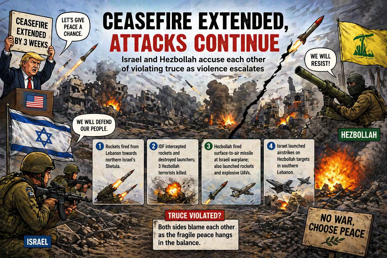 अमेरिका के पूर्व राष्ट्रपति Donald Trump की ओर से इजरायल और लेबनान के बीच जारी संघर्ष में सीजफायर को तीन हफ्तों तक बढ़ाने का ऐलान किया गया, लेकिन जमीनी हालात इससे उलट नजर आए। ऐलान के कुछ ही समय बाद दोनों पक्षों के बीच फिर से भीषण हमले शुरू हो गए।