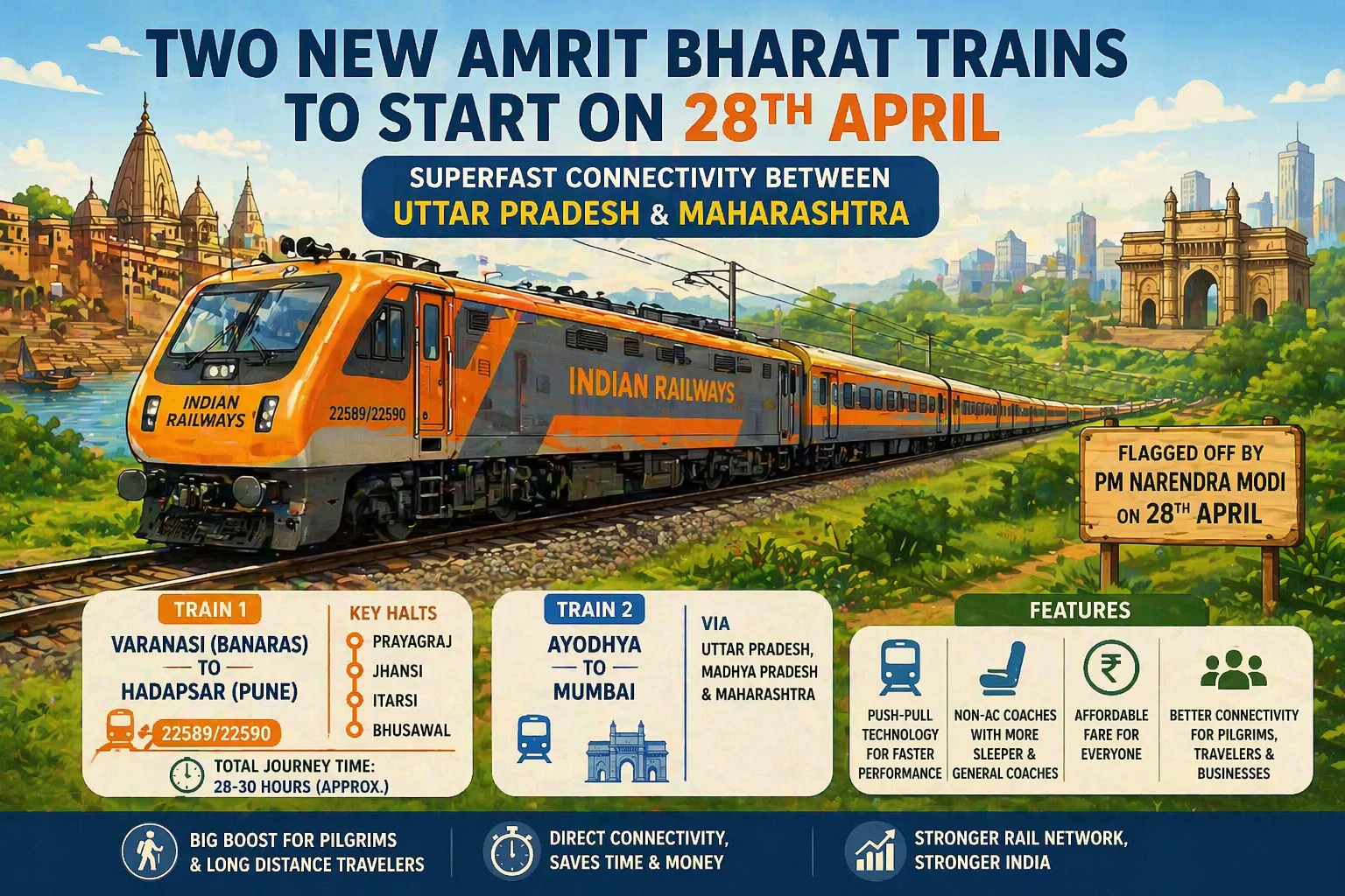 वाराणसी। रेल यात्रियों के लिए बड़ी राहत भरी खबर सामने आई है। 28 अप्रैल को वाराणसी से दो नई ‘अमृत भारत’ ट्रेनों की शुरुआत होने जा रही है, जिससे उत्तर प्रदेश और महाराष्ट्र के बीच यात्रा अधिक तेज, सुगम और किफायती हो जाएगी। प्रधानमंत्री नरेंद्र मोदी इन ट्रेनों को हरी झंडी दिखाकर रवाना करेंगे।