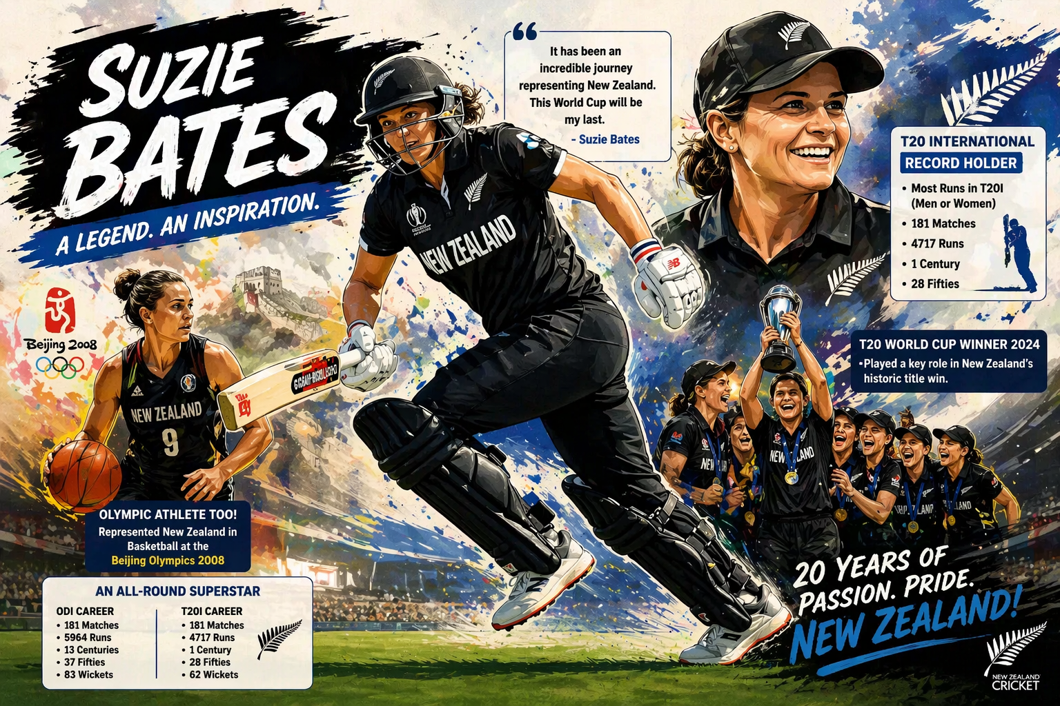 рдЖрдЧрд╛рдореА ICC Women’s T20 World Cup рди рдХреЗрд╡рд▓ рдиреНрдпреВрдЬреАрд▓реИрдВрдб рдмрд▓реНрдХрд┐ рд╡рд┐рд╢реНрд╡ рдХреНрд░рд┐рдХреЗрдЯ рдХреЗ рд▓рд┐рдП рднреА рдЦрд╛рд╕ рд╣реЛрдиреЗ рд╡рд╛рд▓рд╛ рд╣реИ, рдХреНрдпреЛрдВрдХрд┐ рдЗрд╕рдХреЗ рд╕рд╛рде рд╣реА рдПрдХ рдорд╣рд╛рди рдЦрд┐рд▓рд╛рдбрд╝реА рдХрд╛ рд╢рд╛рдирджрд╛рд░ рдХрд░рд┐рдпрд░ рд╕рдорд╛рдкреНрдд рд╣реЛрдЧрд╛ред рд╕реБрдЬреА рдмреЗрдЯреНрд╕ рдХрд╛ рдирд╛рдо рдорд╣рд┐рд▓рд╛ рдХреНрд░рд┐рдХреЗрдЯ рдЗрддрд┐рд╣рд╛рд╕ рдореЗрдВ рд╣рдореЗрд╢рд╛ рд╕реНрд╡рд░реНрдг рдЕрдХреНрд╖рд░реЛрдВ рдореЗрдВ рджрд░реНрдЬ рд░рд╣реЗрдЧрд╛ред