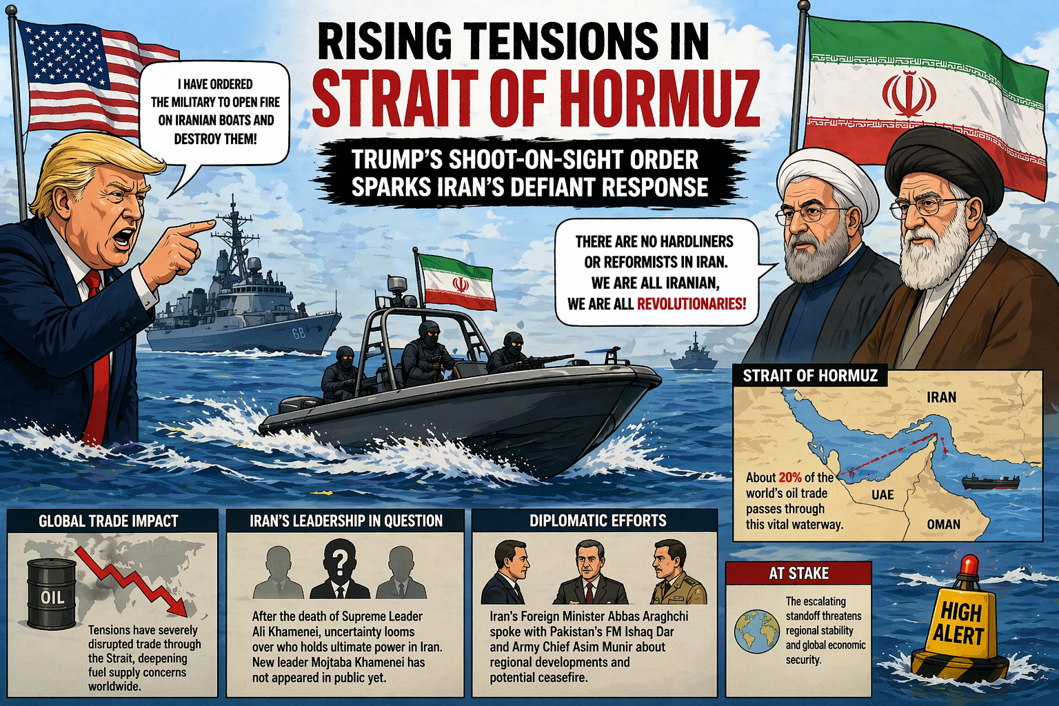 मध्य पूर्व के सबसे संवेदनशील समुद्री मार्ग, होर्मुज जलडमरूमध्य में अमेरिका और ईरान के बीच तनाव खतरनाक स्तर तक पहुंच गया है। अमेरिकी राष्ट्रपति डोनाल्ड ट्रंप के उस बयान के बाद हालात और बिगड़ गए, जिसमें उन्होंने दावा किया कि उन्होंने सेना को ईरान की छोटी नौकाओं पर गोली चलाने और उन्हें नष्ट करने का आदेश दिया है।