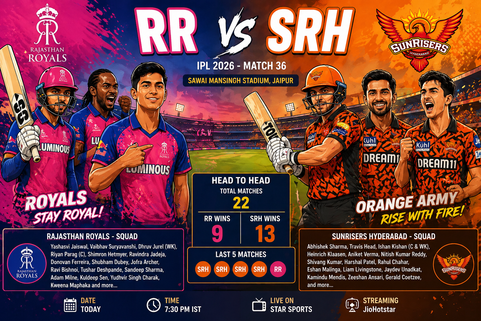 लखनऊ/जयपुर: आईपीएल 2026 का 36वां मुकाबला Rajasthan Royals और Sunrisers Hyderabad के बीच जयपुर के Sawai Mansingh Stadium में खेला जाएगा। दोनों टीमें इस समय शानदार फॉर्म में हैं और पॉइंट्स टेबल के टॉप-4 में जगह बनाए हुए हैं, जिससे यह मुकाबला और भी अहम हो गया है।