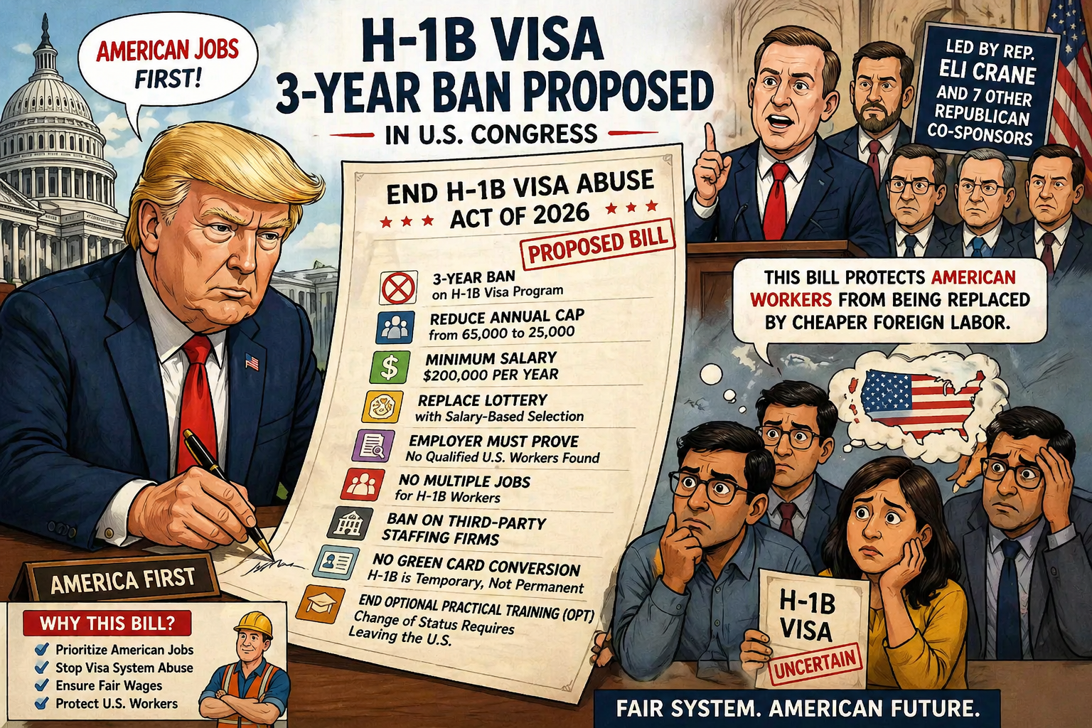 एरिजोना के कांग्रेसमैन एली क्रेन द्वारा पेश किए गए ‘End H-1B Visa Abuse Act of 2026’ का मकसद अमेरिकी नागरिकों के लिए नौकरियों को प्राथमिकता देना बताया गया है। रिपब्लिकन सांसदों का आरोप है कि H-1B कार्यक्रम का दुरुपयोग कर कंपनियां सस्ते विदेशी श्रमिकों को नियुक्त कर रही हैं, जिससे अमेरिकी कामगारों के अवसर कम हो रहे हैं।