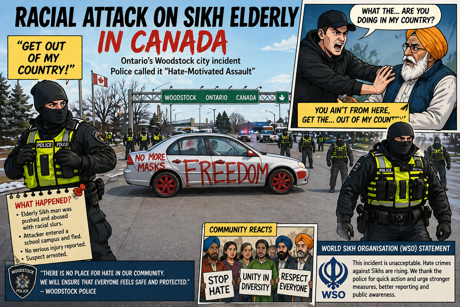 टोरंटो/वुडस्टॉक: कनाडा के ओंटारियो प्रांत के वुडस्टॉक शहर में एक बुजुर्ग सिख व्यक्ति पर नस्लीय हमला किए जाने का मामला सामने आया है। Toronto Police Service ने इस घटना को “हेट-मोटिवेटेड असॉल्ट” बताते हुए जांच शुरू की है।
