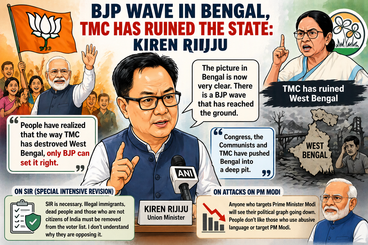 केंद्रीय मंत्री किरण रिजिजू ने पश्चिम बंगाल की राजनीति को लेकर बड़ा बयान देते हुए कहा है कि राज्य में भारतीय जनता पार्टी की लहर साफ दिखाई दे रही है। उन्होंने आरोप लगाया कि तृणमूल कांग्रेस (TMC) ने बंगाल को बर्बादी की ओर धकेल दिया है और अब हालात बदलने के लिए बीजेपी का सत्ता में आना जरूरी है।