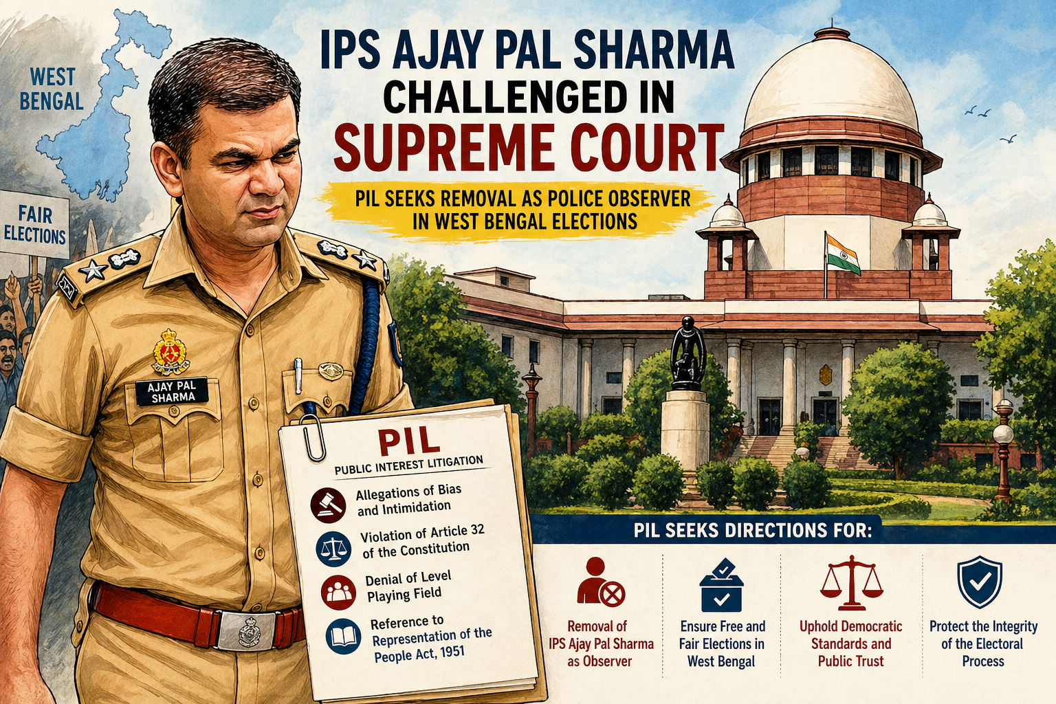 पश्चिम बंगाल विधानसभा चुनाव 2026 के बीच एक बड़ा संवैधानिक मुद्दा सामने आया है। यूपी कैडर के चर्चित IPS अधिकारी अजय पाल शर्मा के खिलाफ Supreme Court of India में जनहित याचिका (PIL) दाखिल की गई है। याचिका में उन्हें तत्काल प्रभाव से चुनावी पुलिस ऑब्जर्वर पद से हटाने की मांग की गई है।