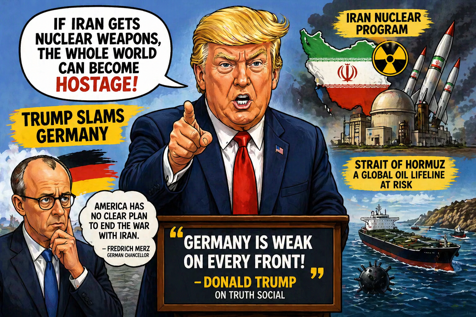 ट्रंप ने अपने सोशल मीडिया प्लेटफॉर्म पर पोस्ट करते हुए जर्मनी के चांसलर Friedrich Merz पर निशाना साधा। उन्होंने कहा कि मर्ज का ईरान के मुद्दे पर रुख गलत और खतरनाक है।