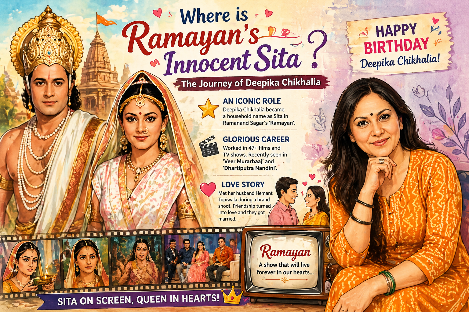 рдЯреАрд╡реА рдЗрддрд┐рд╣рд╛рд╕ рдХреЗ рд╕рдмрд╕реЗ рд▓реЛрдХрдкреНрд░рд┐рдп рдзрд╛рд░рд╛рд╡рд╛рд╣рд┐рдХреЛрдВ рдореЗрдВ рд╕реЗ рдПрдХ рд░рд╛рдорд╛рдпрдг рдЖрдЬ рднреА рджрд░реНрд╢рдХреЛрдВ рдХреЗ рджрд┐рд▓реЛрдВ рдореЗрдВ рдЦрд╛рд╕ рдЬрдЧрд╣ рд░рдЦрддрд╛ рд╣реИред рдЗрд╕ рд╢реЛ рдореЗрдВ рдорд╛рддрд╛ рд╕реАрддрд╛ рдХрд╛ рдХрд┐рд░рджрд╛рд░ рдирд┐рднрд╛рдХрд░ рдШрд░-рдШрд░ рдореЗрдВ рдкрд╣рдЪрд╛рди рдмрдирд╛рдиреЗ рд╡рд╛рд▓реА рджреАрдкрд┐рдХрд╛ рдЪрд┐рдЦрд▓рд┐рдпрд╛ рдЖрдЬ рдЕрдкрдирд╛ рдЬрдиреНрдорджрд┐рди рдордирд╛ рд░рд╣реА рд╣реИрдВред рдЙрдирдХреЗ рдЗрд╕ рдЦрд╛рд╕ рдореМрдХреЗ рдкрд░ рдЖрдЗрдП рдЬрд╛рдирддреЗ рд╣реИрдВ рдЙрдирдХреА рдЬрд┐рдВрджрдЧреА рдФрд░ рдХрд░рд┐рдпрд░ рд╕реЗ рдЬреБрдбрд╝реА рджрд┐рд▓рдЪрд╕реНрдк рдмрд╛рддреЗрдВред