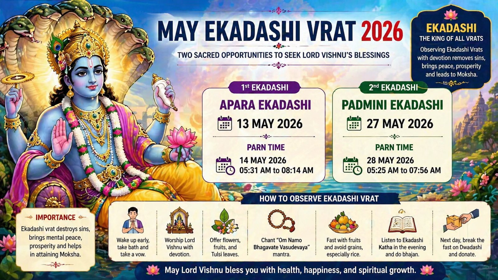 मई 2026 की पहली एकादशी 13 मई (अपरा एकादशी) को पड़ेगी। इसका पारण 14 मई की सुबह 05:31 बजे से 08:14 बजे के बीच किया जाएगा।