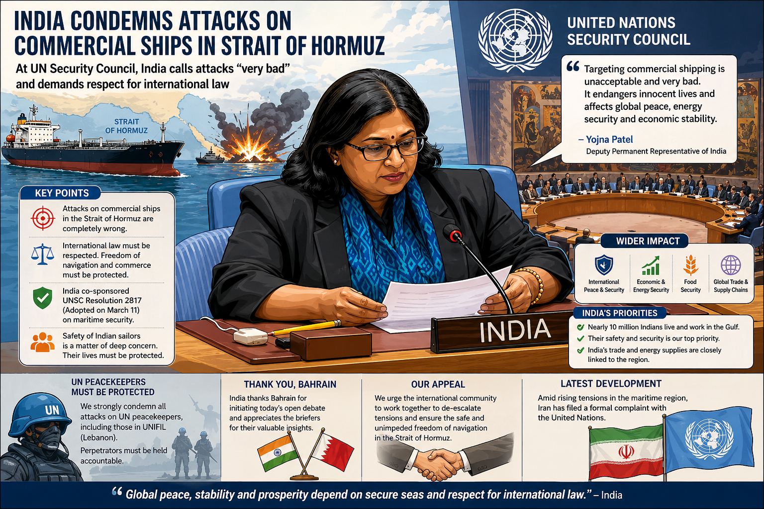рднрд╛рд░рдд рдиреЗ Strait of Hormuz рдореЗрдВ рдХрдорд░реНрд╢рд┐рдпрд▓ рдЬрд╣рд╛рдЬреЛрдВ рдкрд░ рд╣реЛ рд░рд╣реЗ рд╣рдорд▓реЛрдВ рдХреЛ тАЬрдмрд╣реБрдд рдмреБрд░рд╛тАЭ рдФрд░ рдЕрд╕реНрд╡реАрдХрд╛рд░реНрдп рдмрддрд╛рдпрд╛ рд╣реИред рд╕рдВрдпреБрдХреНрдд рд░рд╛рд╖реНрдЯреНрд░ рд╕реБрд░рдХреНрд╖рд╛ рдкрд░рд┐рд╖рдж рдореЗрдВ рднрд╛рд░рдд рдХреА рдбрд┐рдкреНрдЯреА рдкрд░рдорд╛рдиреЗрдВрдЯ рд░рд┐рдкреНрд░реЗрдЬреЗрдВрдЯреЗрдЯрд┐рд╡ Yojna Patel рдиреЗ рд╕рд╛рдл рдХрд╣рд╛ рдХрд┐ рдРрд╕реЗ рд╣рдорд▓реЗ рди рд╕рд┐рд░реНрдл рдЕрдВрддрд░рд░рд╛рд╖реНрдЯреНрд░реАрдп рдХрд╛рдиреВрди рдХрд╛ рдЙрд▓реНрд▓рдВрдШрди рд╣реИрдВ, рдмрд▓реНрдХрд┐ рд╡реИрд╢реНрд╡рд┐рдХ рд╡реНрдпрд╛рдкрд╛рд░ рдФрд░ рдКрд░реНрдЬрд╛ рд╕реБрд░рдХреНрд╖рд╛ рдХреЗ рд▓рд┐рдП рднреА рдЧрдВрднреАрд░ рдЦрддрд░рд╛ рд╣реИрдВред