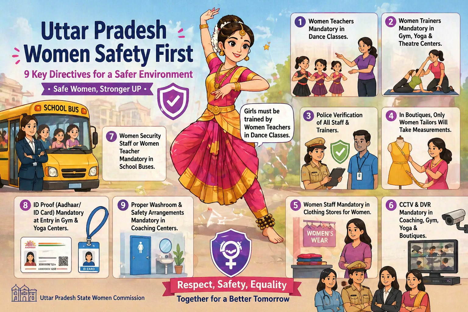 उत्तर प्रदेश राज्य महिला आयोग ने महिलाओं और लड़कियों की सुरक्षा को मजबूत करने के उद्देश्य से राज्यभर में सख्त दिशा-निर्देश जारी किए हैं। एक याचिका पर सुनवाई के बाद आयोग ने मुख्य सचिव को 9 सूत्रीय आदेश लागू करने के निर्देश दिए हैं, जिनका सीधा असर डांस क्लास, जिम, योगा सेंटर, बुटीक और कोचिंग संस्थानों पर पड़ेगा।